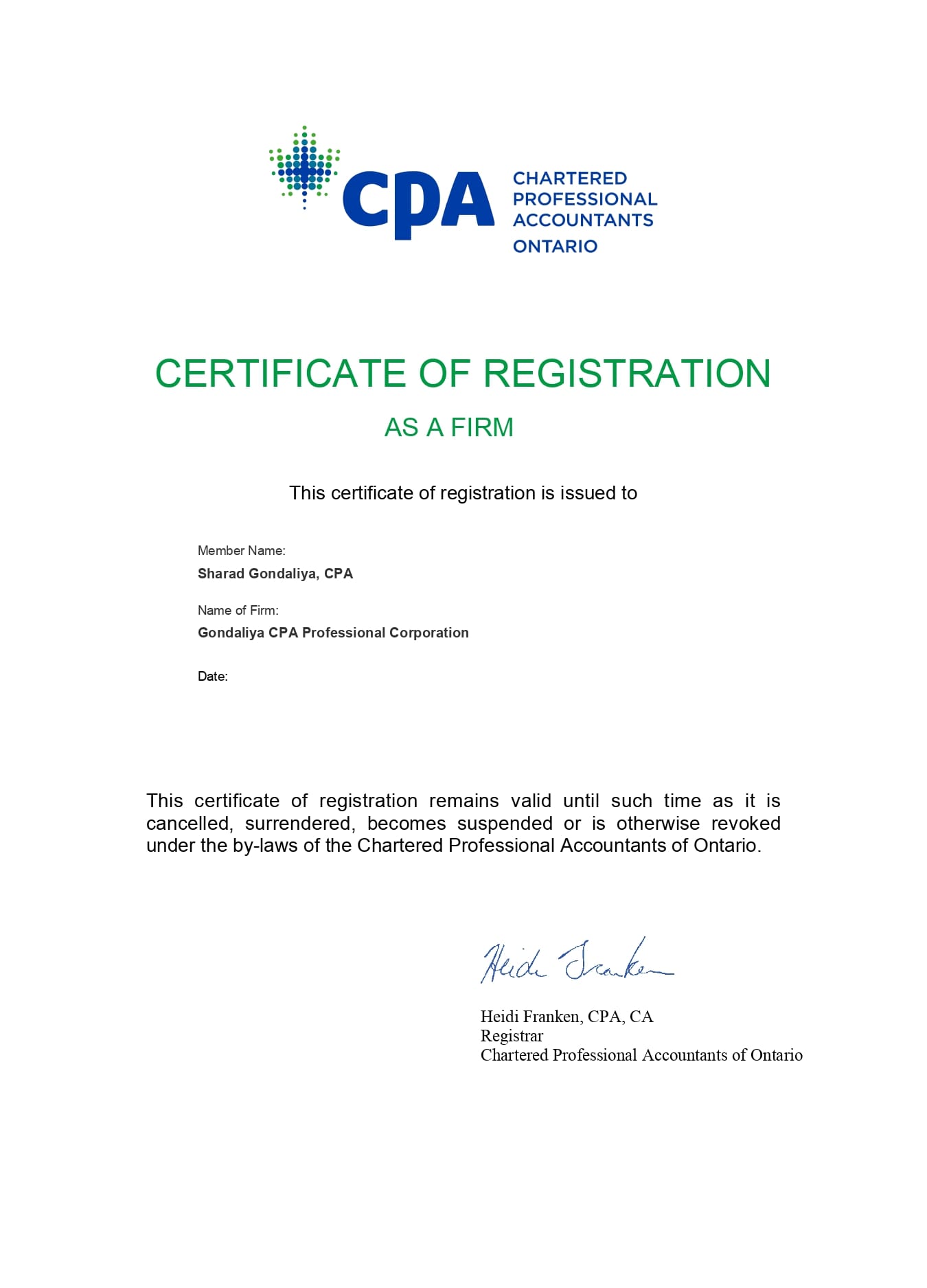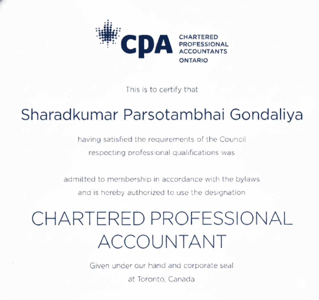 Sharadkumar Gondaliya is licensed with CPA Ontario as a Chartered Professional Accountant, meeting professional, ethical, and continuing competency requirements.