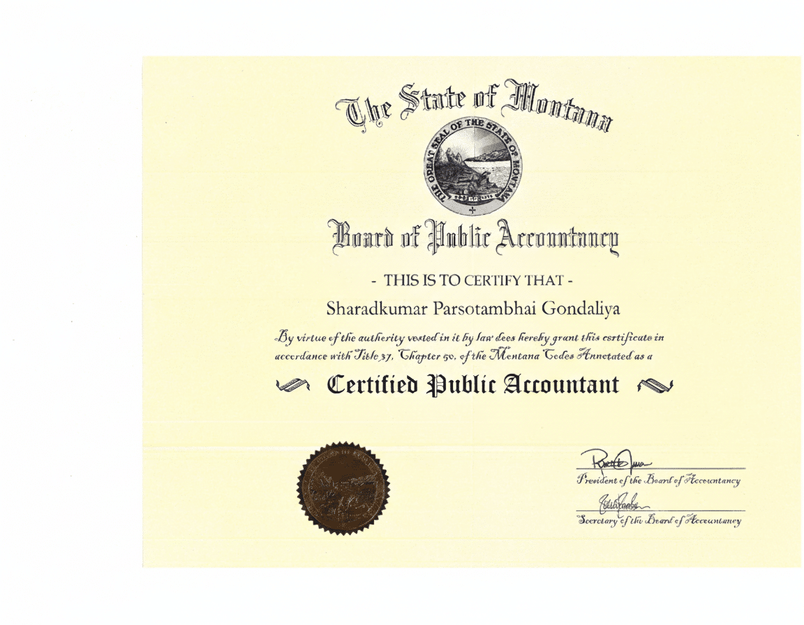 Sharad is licensed as a Certified Public Accountant in Montana, demonstrating recognized qualification in a U.S. jurisdiction.