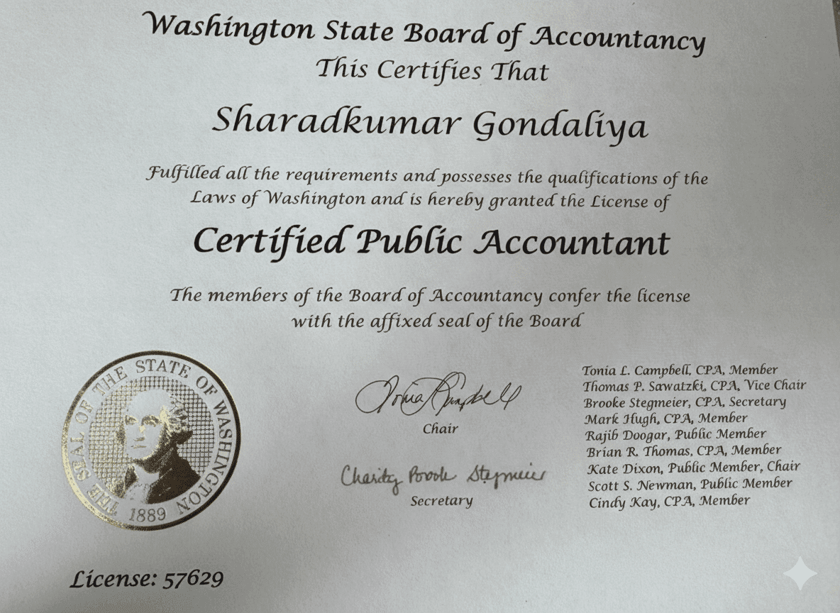 Sharad is licensed as a Certified Public Accountant in Washington State, strengthening multi-jurisdiction credibility for cross-border situations.